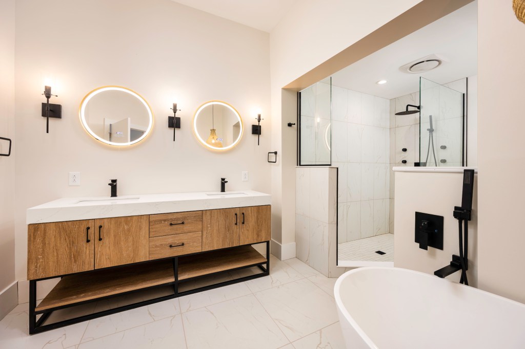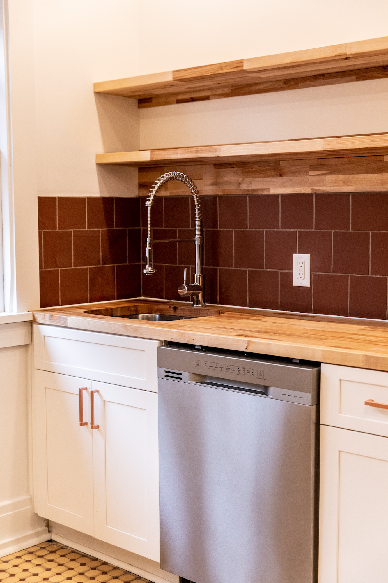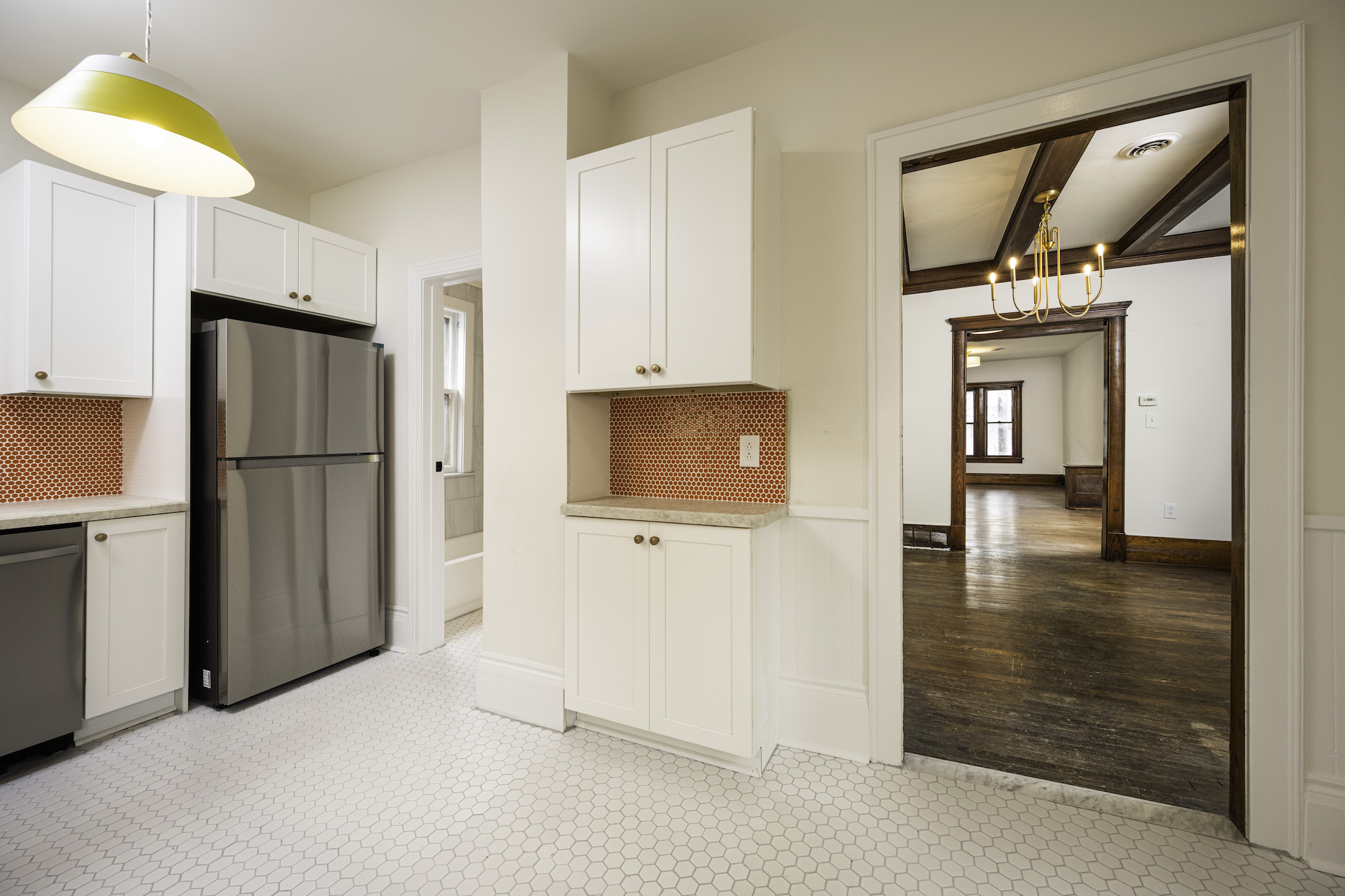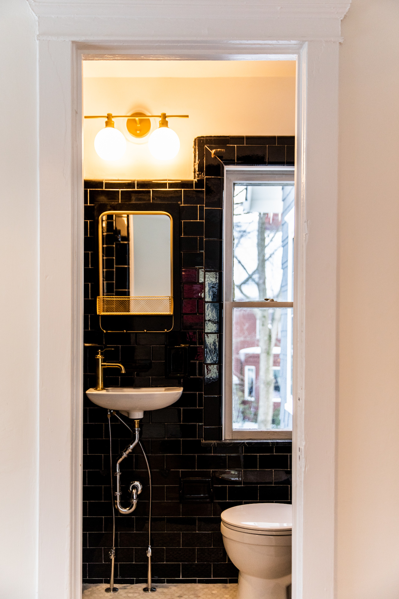 The goal was to make the home feel modern while using materials that nodded to what would have been appropriate in the 1860s, such as penny tile and hexagon tile. The result is a redesigned home that remains situated within its historic context.